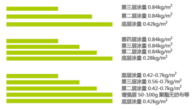 3、增设加强层涂刷法:总厚度:1.5-2.mm,总用料量:1.82-2.52kgm3,适用于变形较大的防水工程以及异性部位(墙根、檐沟、天沟、阴阳角等)的增强。