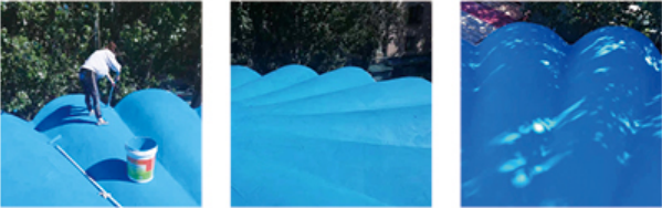 3、具有加强层时的施工,在涂刮第一道涂层后可立即铺贴聚酯无纺布或尼龙加筋网格布,加强层应铺贴平整,不能有褶皱,并用刷子刷实;